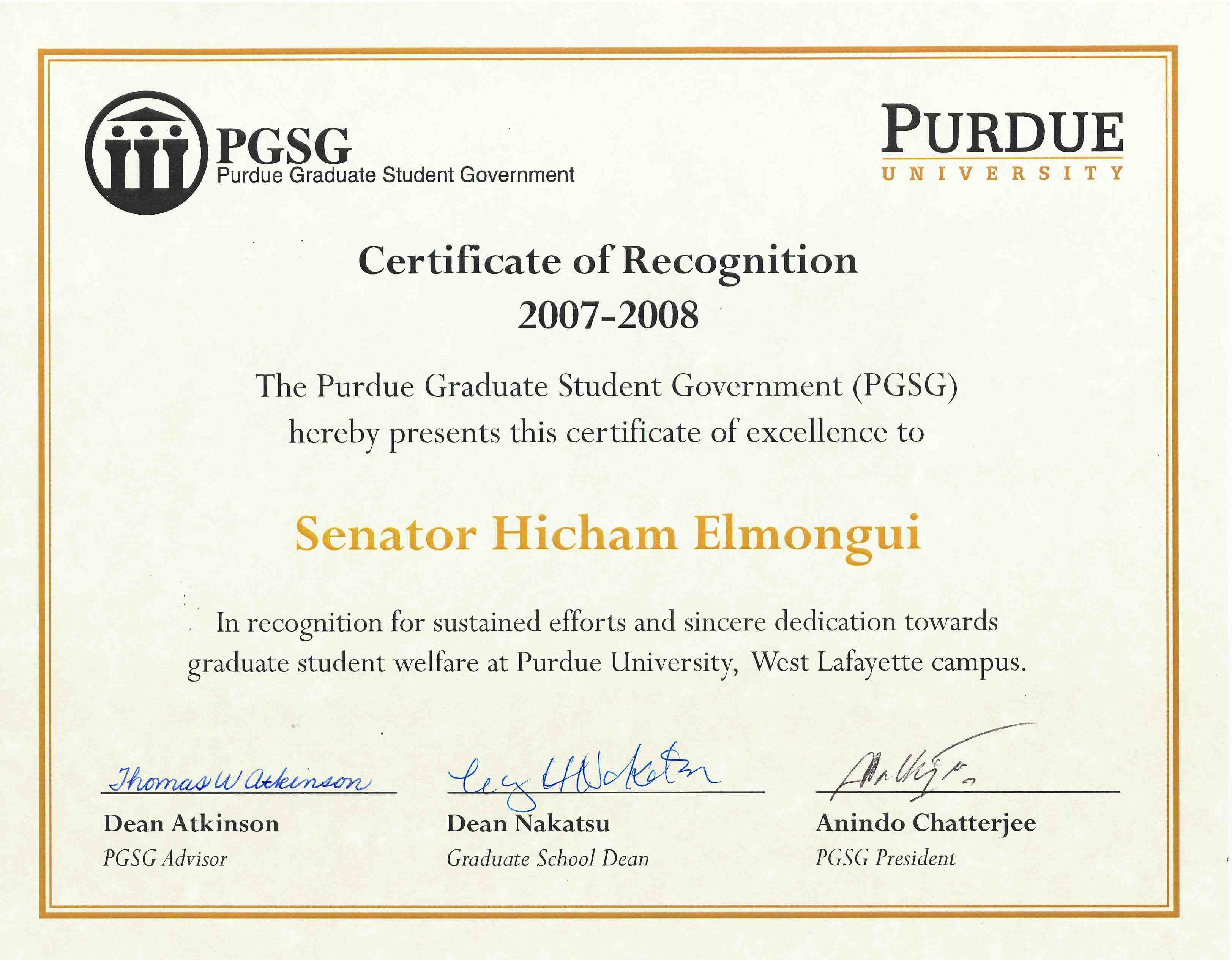 - Purdue Graduate Student Senate, 2007-2008. Here is the Certificate of Recognition.