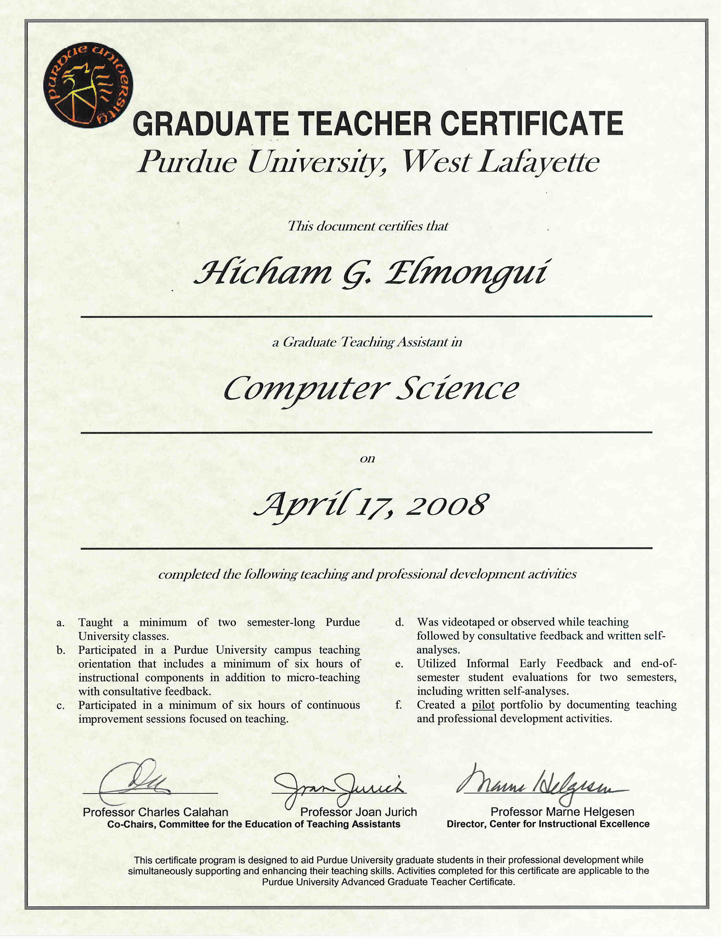 - Purdue Computer Science Department Outstanding Teaching Assistant (2002-2003)